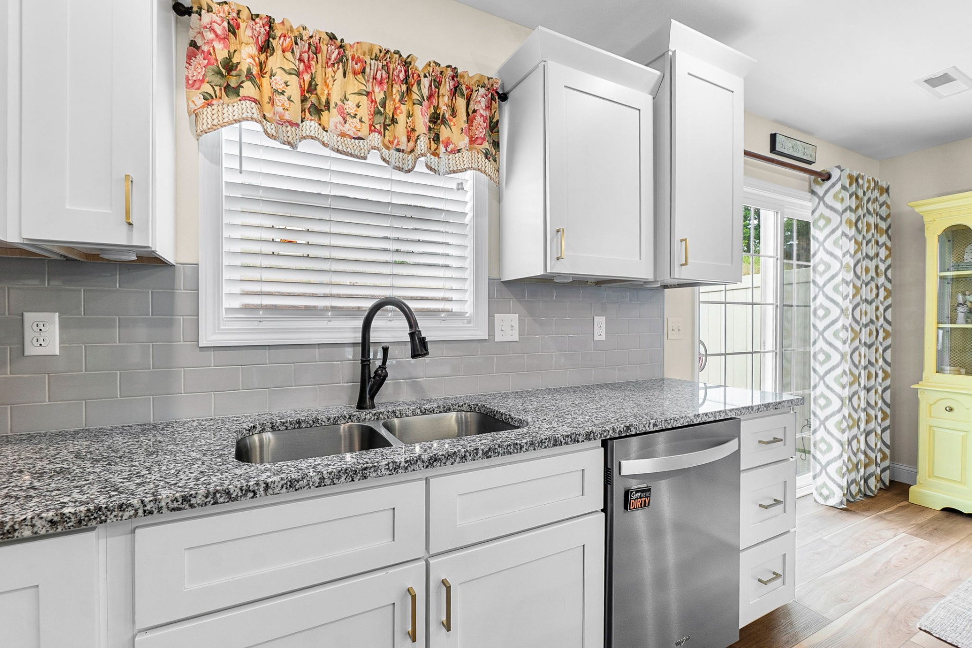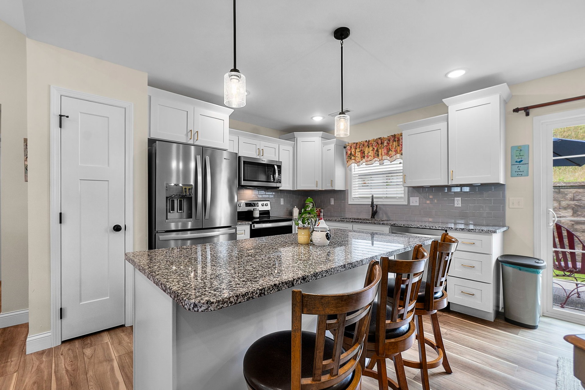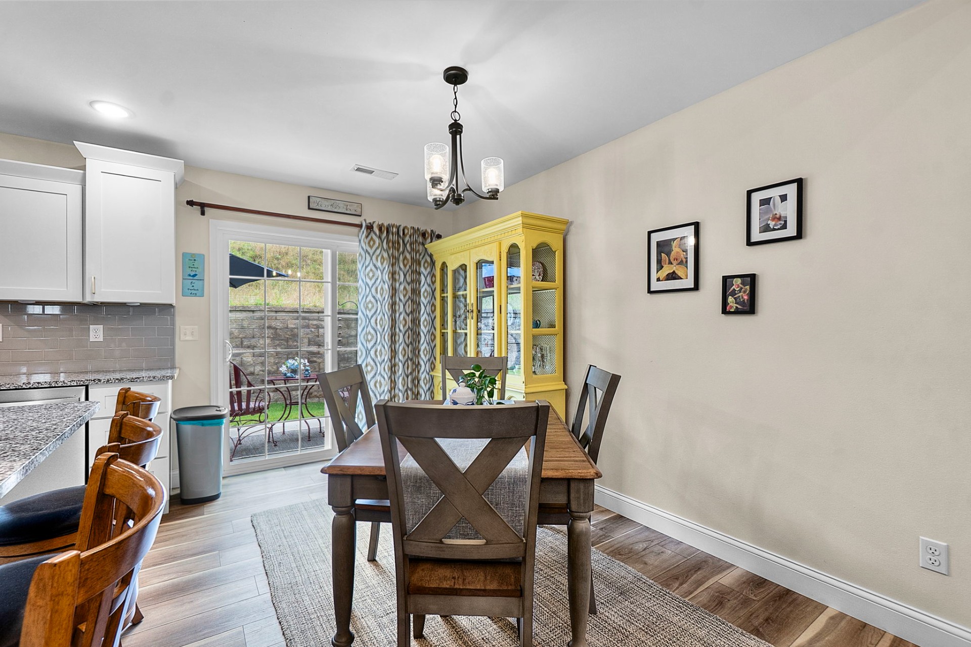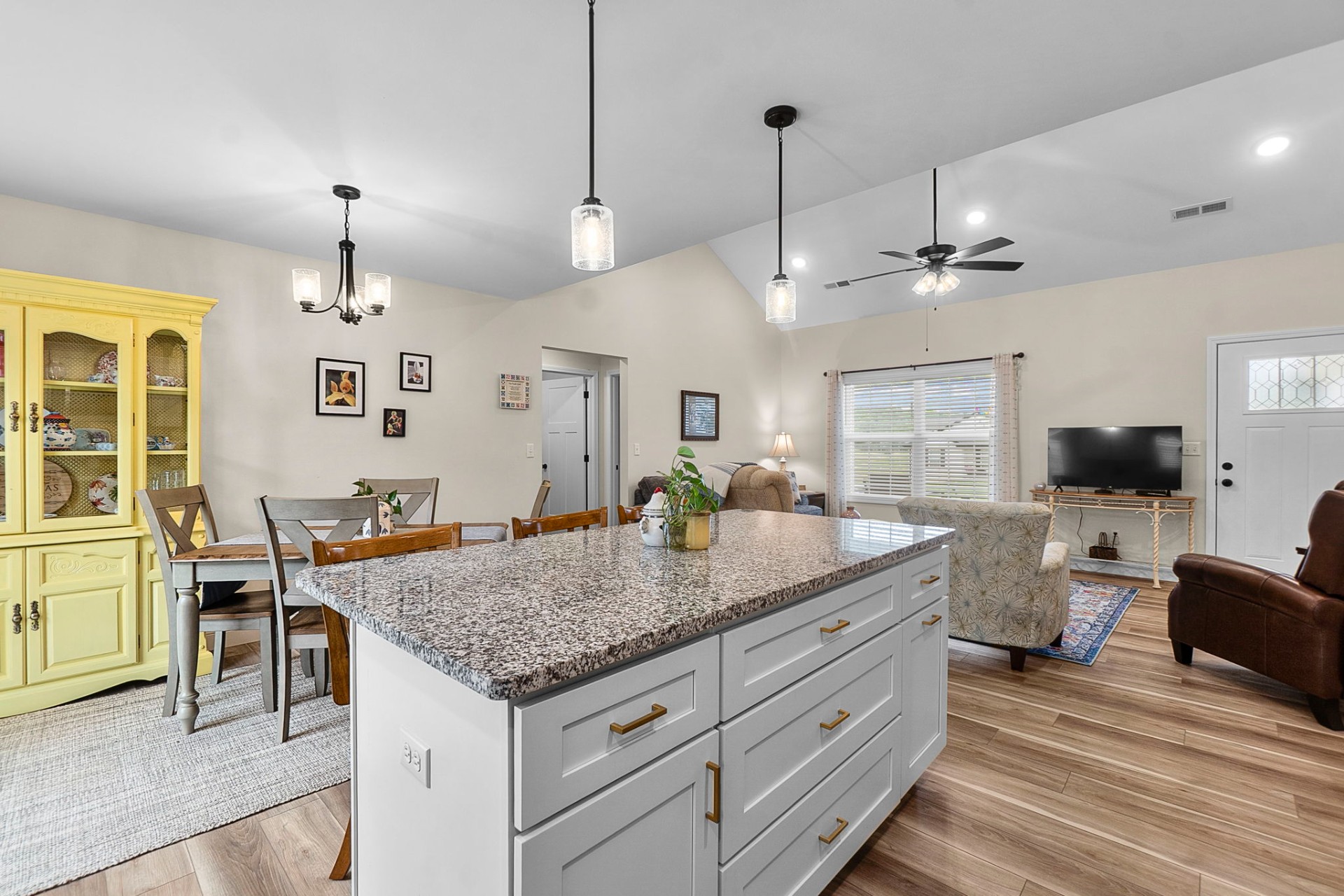 Beautifully maintained and ideally located near schools and shopping, this 3-bedroom, 2-bath home offers comfortable, open-concept living with a desirable split-bedroom floor plan. The kitchen features a spacious island, shaker-style cabinetry, and sleek granite countertops—perfect for everyday living and entertaining. Sliding doors off the dining area lead to a private patio, ideal for outdoor dining or relaxing. Plantation blinds throughout, along with an established yard and attractive landscaping, complete the picture.